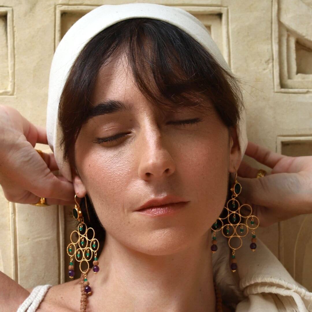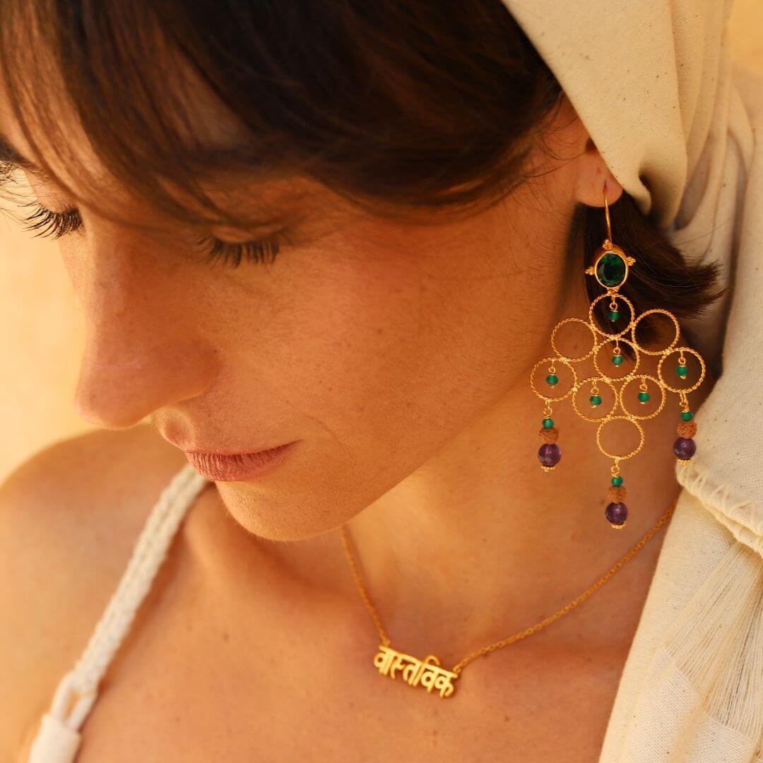 Our Devika Blessing Goddess Earrings are a testament to divine beauty and spiritual richness. Handcrafted with .925 silver wire and adorned with a lavish 22-carat gold plating, these earrings feature 8 x 10mm faceted green agate oval gemstones complemented by a cascading arrangement of 4mm sacred rudraksha, green agate, and faceted amethyst beads. The Sanskrit word ‘Devika’ translates to ‘little goddess’, encapsulating the essence of feminine divinity. These earrings channel the power of the Divine Mother, Lakshmi, symbolizing confidence, competence, prosperity, and abundance. Blessed and fully activated, the Devika Earrings serve as a spiritual conduit, infusing your life with the divine energy of abundance and prosperity. They aren’t just an accessory, but a connection to the divine feminine, enhancing your spiritual journey while adding a touch of elegance to your ensemble.