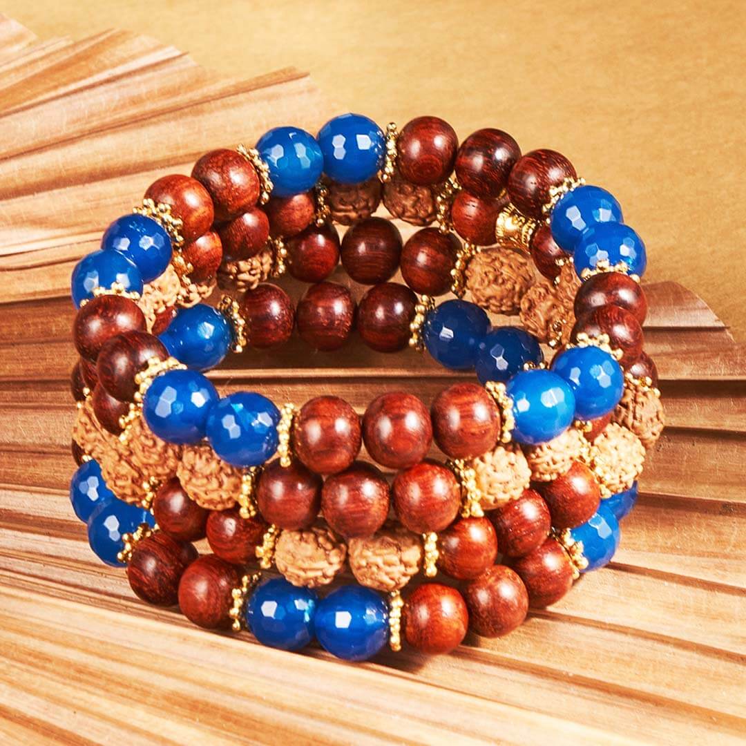8 mm sacred rudraksha, 8mm red sandalwood, 8mm blue agate, gold brass spacer components, 22k gold plating, strung on elastic thread